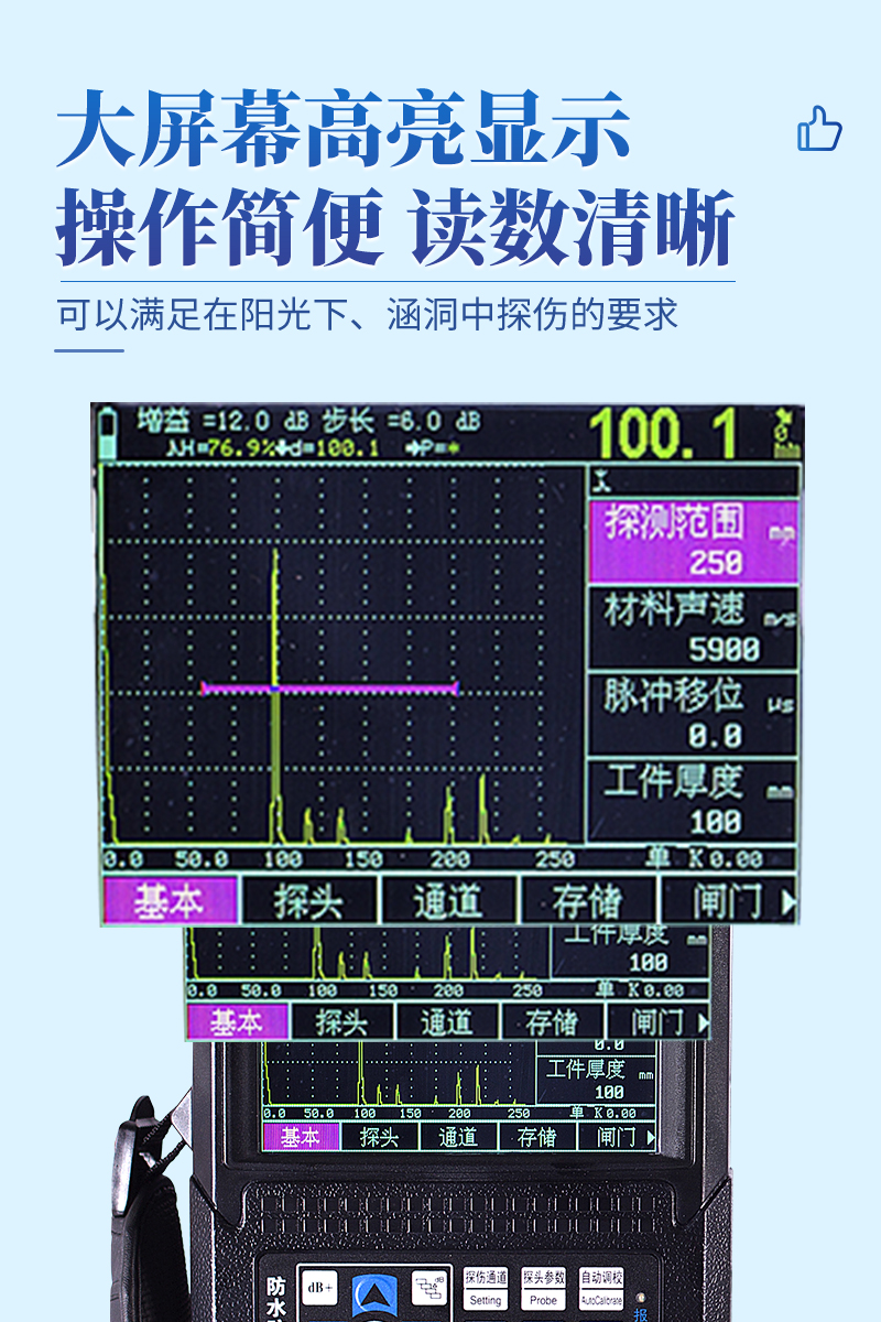 大屏幕高亮顯示,可以滿足在陽(yáng)光下、涵洞中探傷的要求。